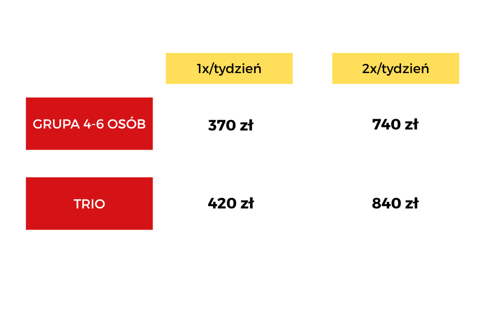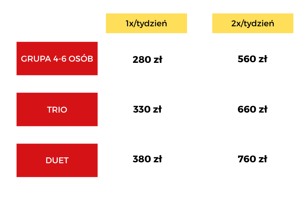 Tak, w swojej ofercie mamy również zajęcia w trio, duetach oraz indywidualne. Zapoznaj się z powyższym cennikiem, a jeśli której z opcji nie ma, skontaktuj się z nami, aby poznać szczegóły.